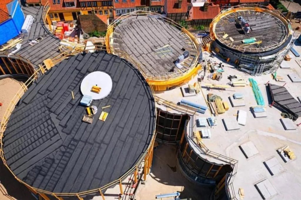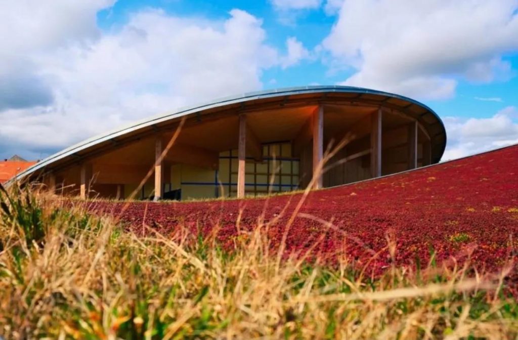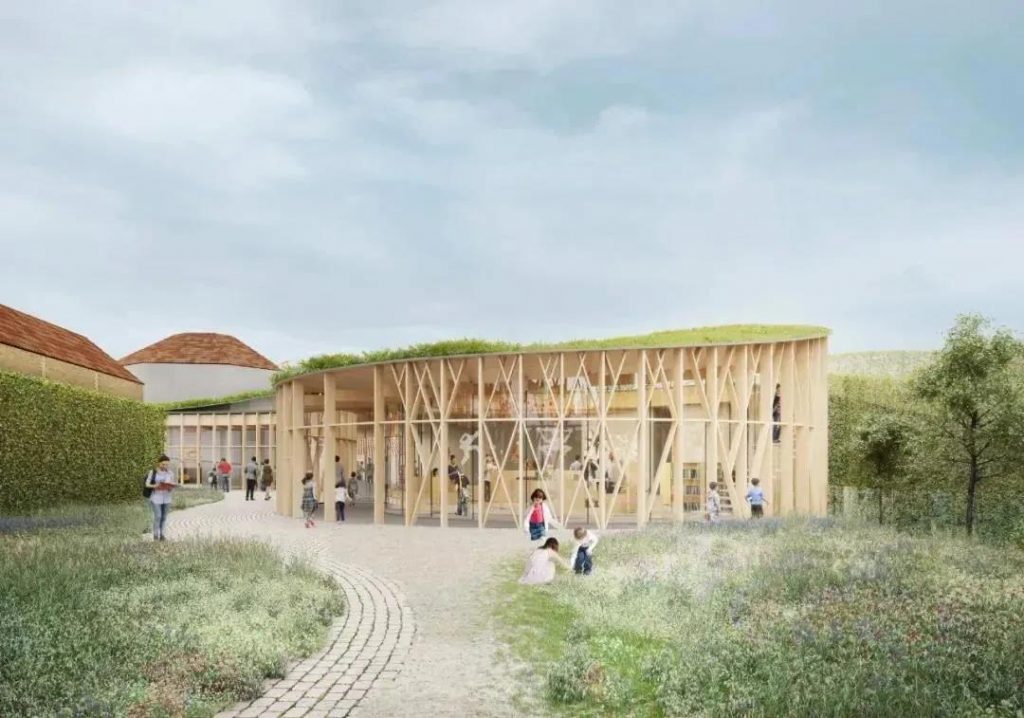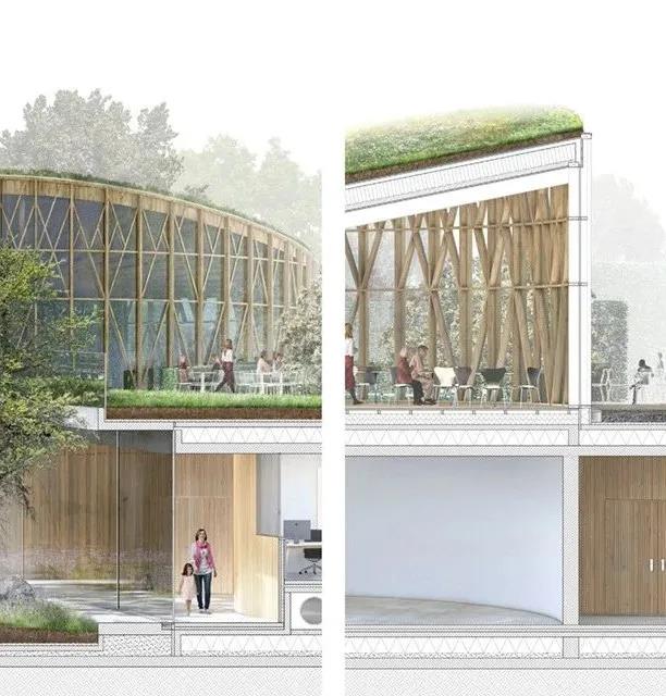 在原本紅瓦白墻、平面排列的方方正正的小鎮(zhèn)中,隈研吾插入了一個(gè)個(gè)用玻璃和木材圍護(hù)的圓柱體,共占地9000㎡,地面和屋頂都種滿了綠色植物。從小鎮(zhèn)的上空俯瞰,就像中央種了一棵棵茂密的大樹。