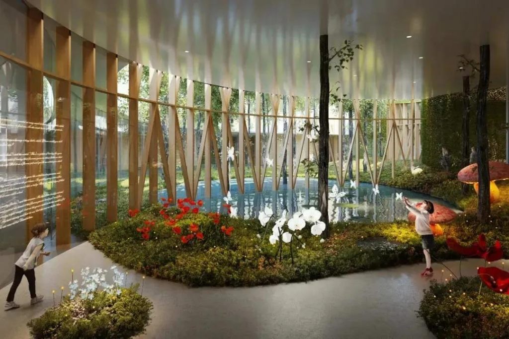 透過玻璃幕墻,可以與外部自然環(huán)境“對(duì)話”,也可以感受不同光線帶來的空間變化體驗(yàn)。幕墻上呈現(xiàn)著童話故事中的片段。